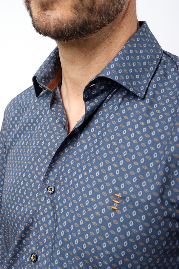 La americana de dos aberturas traseras para un mejor ajuste presenta solapas con muesca, cierre frontal mediante dos botones, un bolsillo a la altura del pecho y dos bolsillos con solapa, puño con cuatro botones, forro y tres bolsillos interiores.